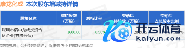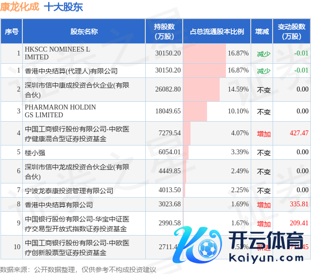 证券之星音尘,12月9日发布公告《康龙化成:对于握股5%以上鼓吹的一致活动东谈主减握计算推论完成的公告》,其鼓吹深圳市信中龙成投资结伴企业(有限结伴)于2024年11月6日至2024年12月6白昼策画减握1600.0万股,占公司现在总股本的0.8952%,变动时分该股股价着落3.46%kaiyun官方网站,甘休12月6日收盘报29.55元。